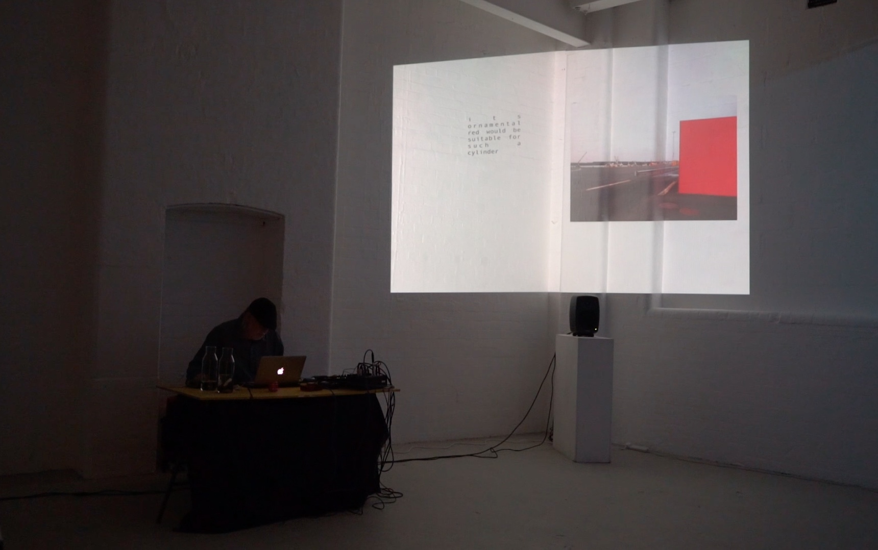still from video footage; performance of Island | Fjorar (dissolve) at Hyperobjects exhibition, Catalyst Arts, Belfast 7-11-2019