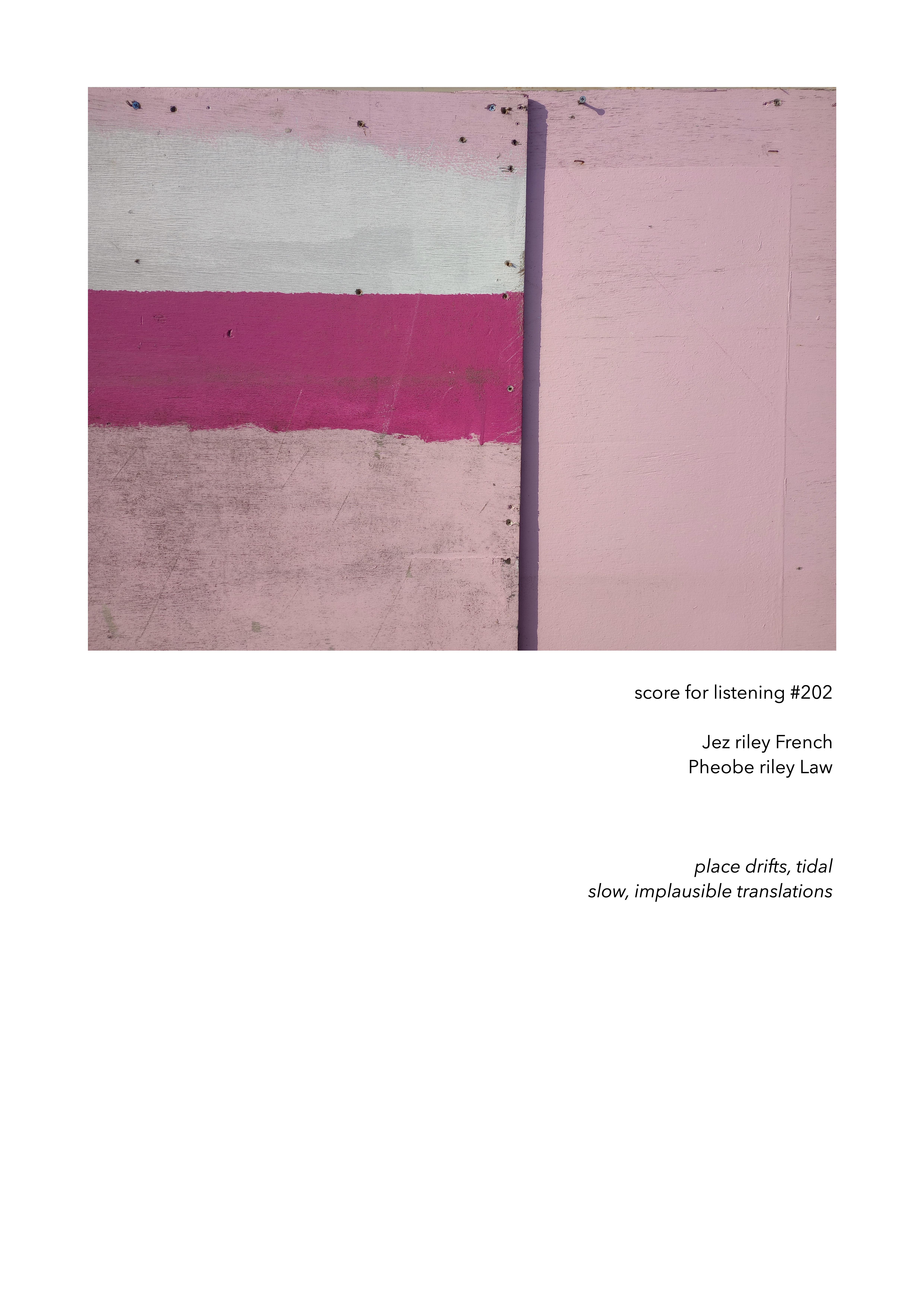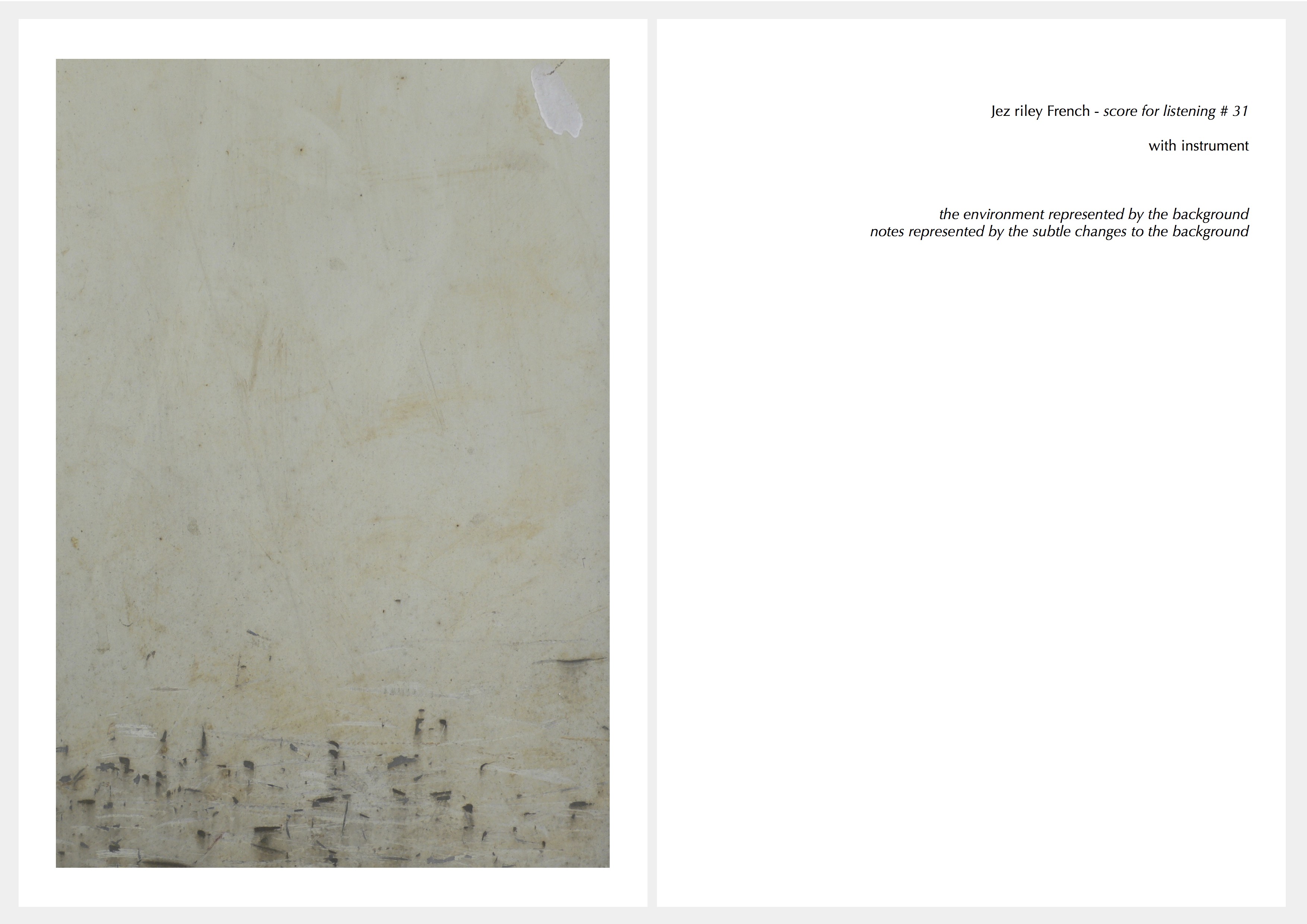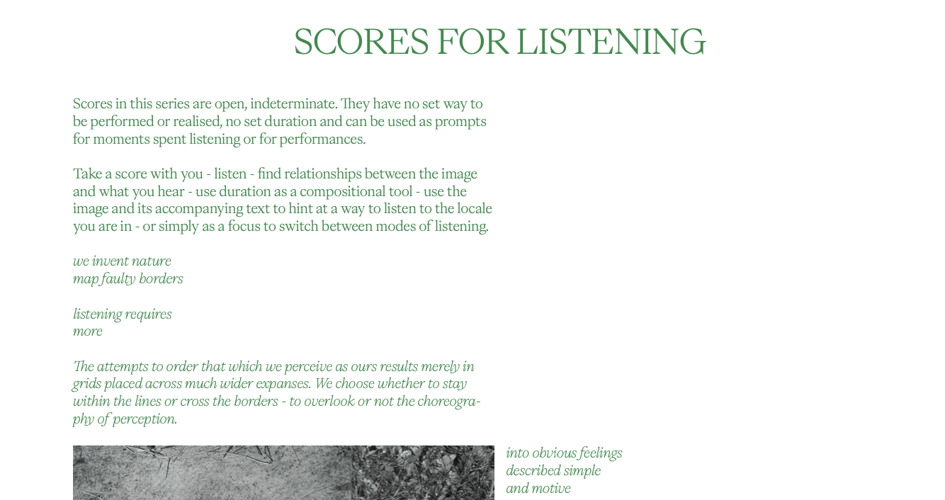 'scores for listening' is a term coined by myself some years ago for works, mostly using text and photographic images, that act as cues for listening experiences. Although the term have since been used by other artists on a personal level I feel there is a strong connection between its original use and the scores created within it.