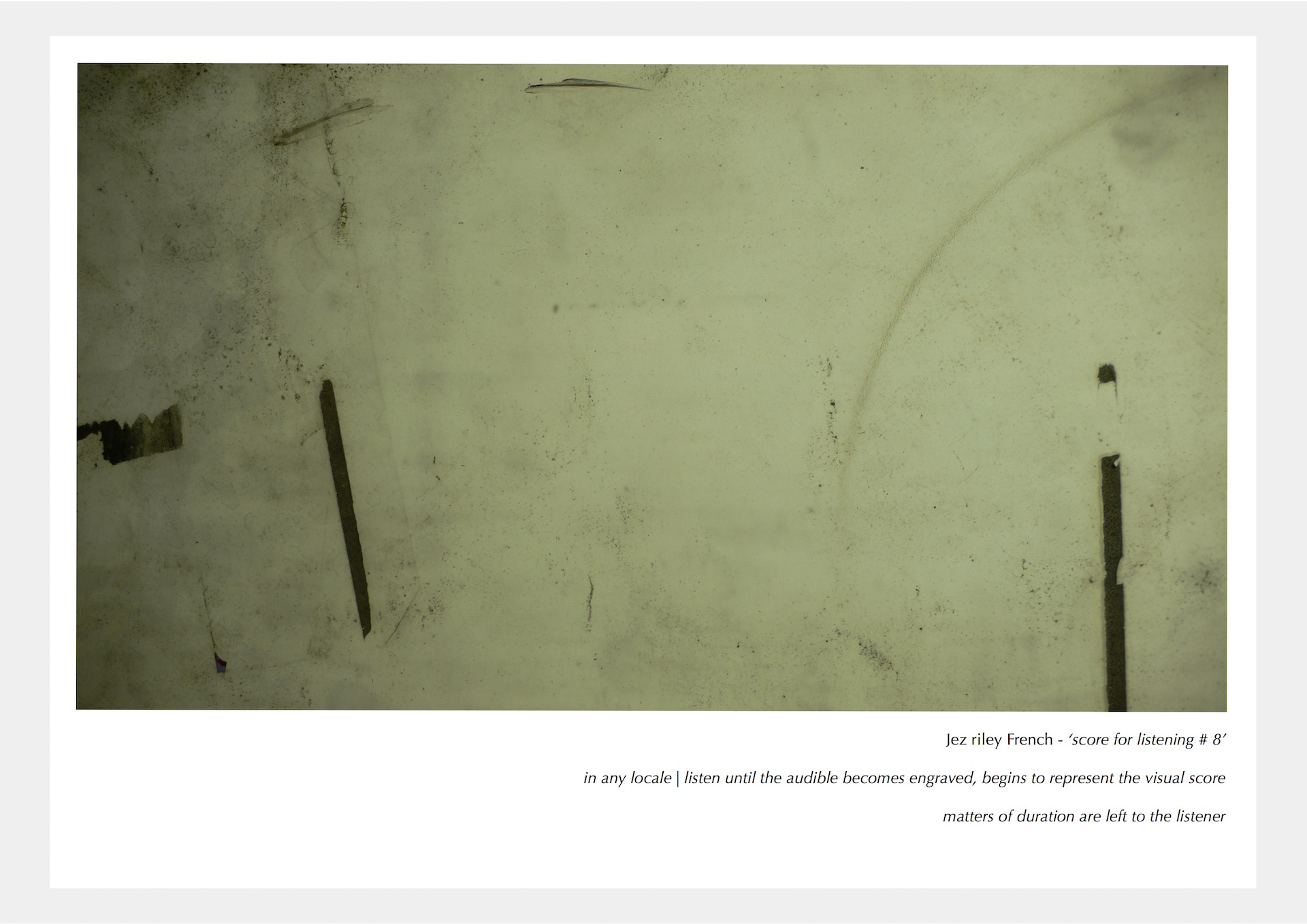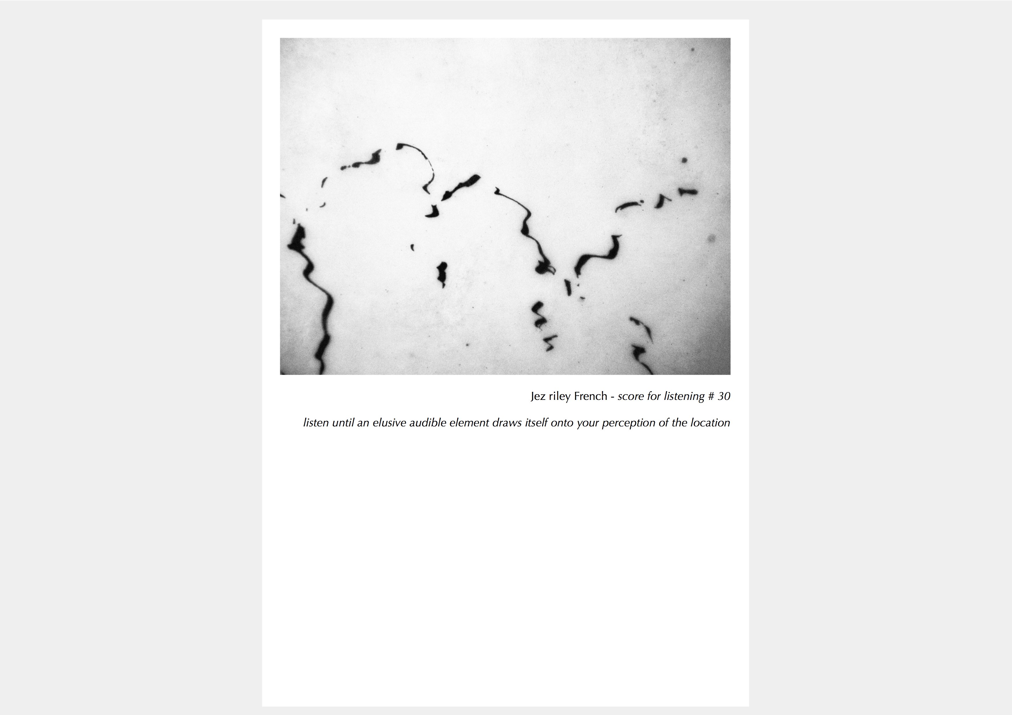'Jez riley French’s photographic scores series is a compelling intervention in this sea of images. They invite the viewer to see them as conduits, representations, translations or spurs for sound – and this remediation has the effect of reversing some of the effects of our image- saturated culture. Where time in the age of the digital photograph is produced by gliding from one image to the next, French’s photos attempt to bring temporality into the experience of viewing. The images manufacture an experience of time through the visual evocation of sound and soundscapes....By introducing the experience of duration into our consumption of images, via the mediation of phonography, they invite us to attend seriously to our mediated environment and consider our contribution to it'