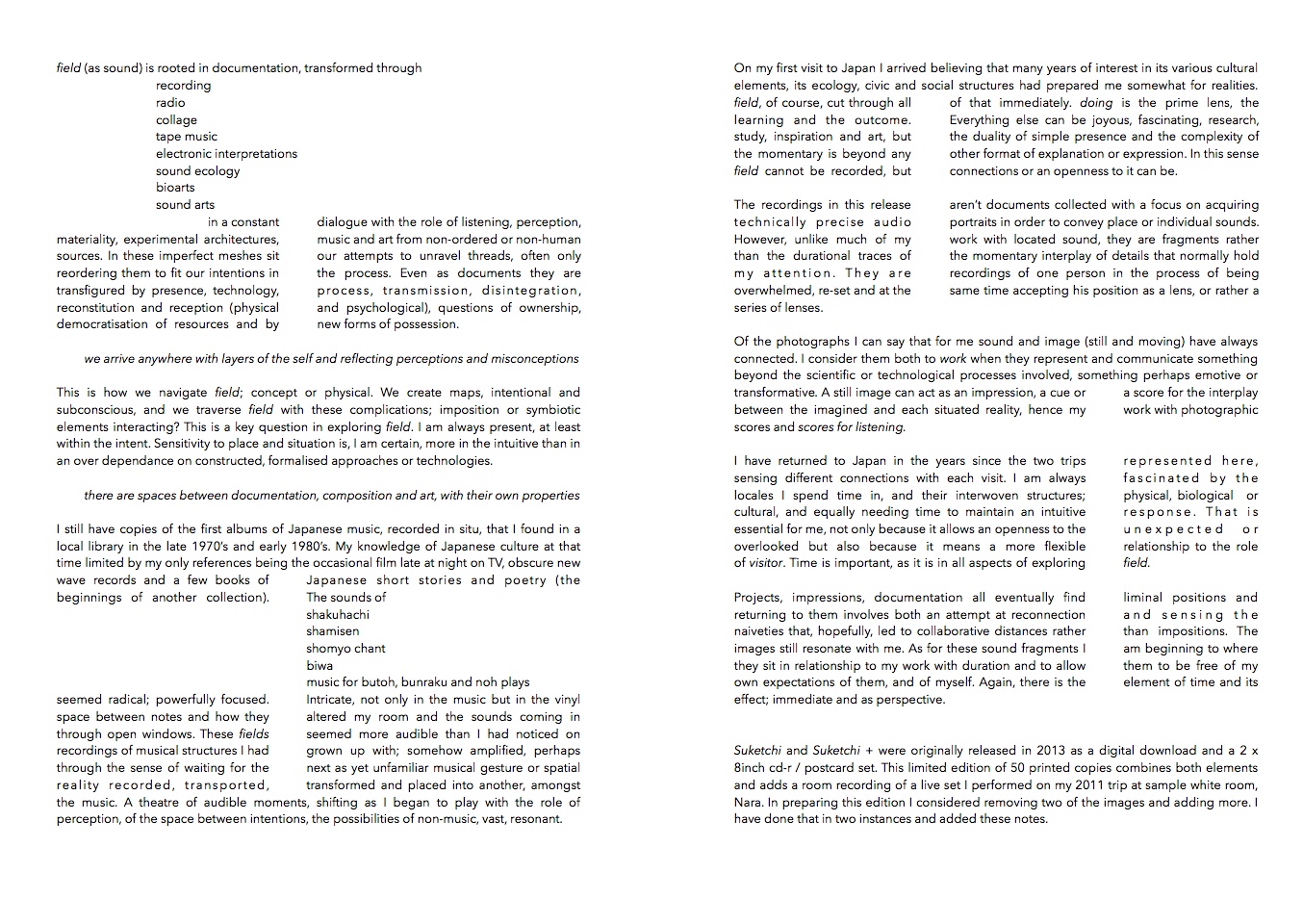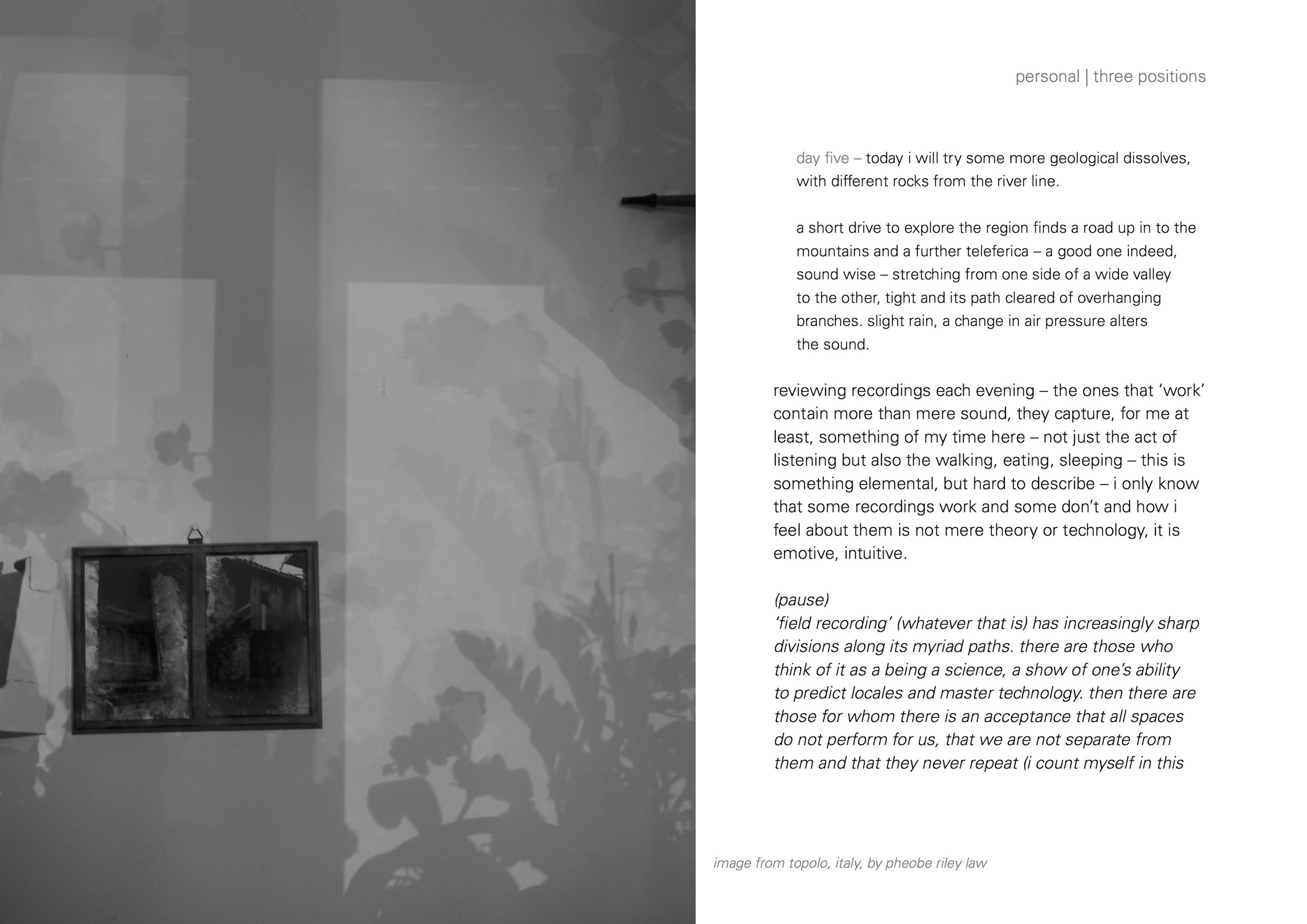 TST: Photography is another art form that repeats itself in your practice. What for you is the relationship between photography and sound recording? How do you develop and work on your ideas in the two media?