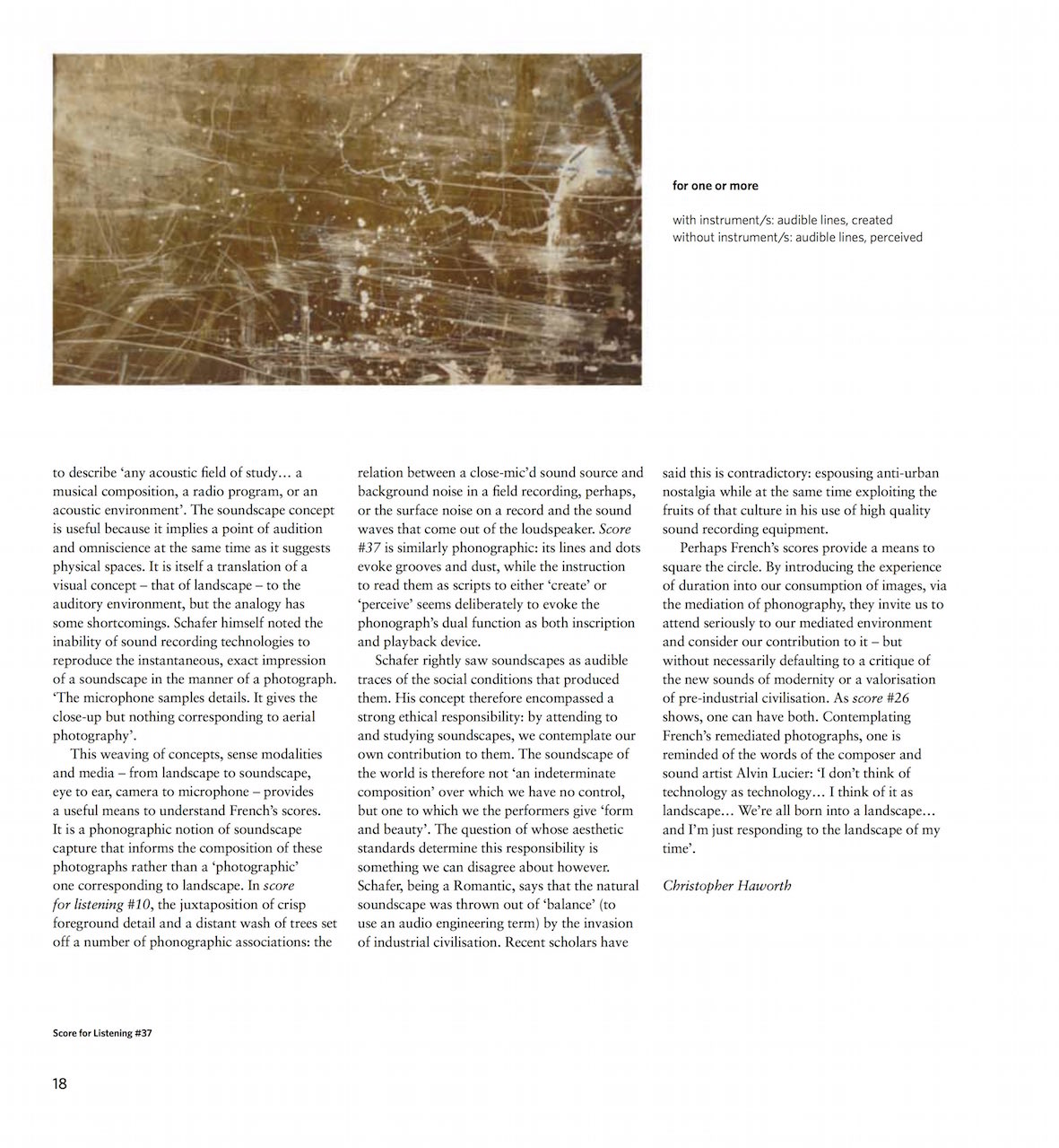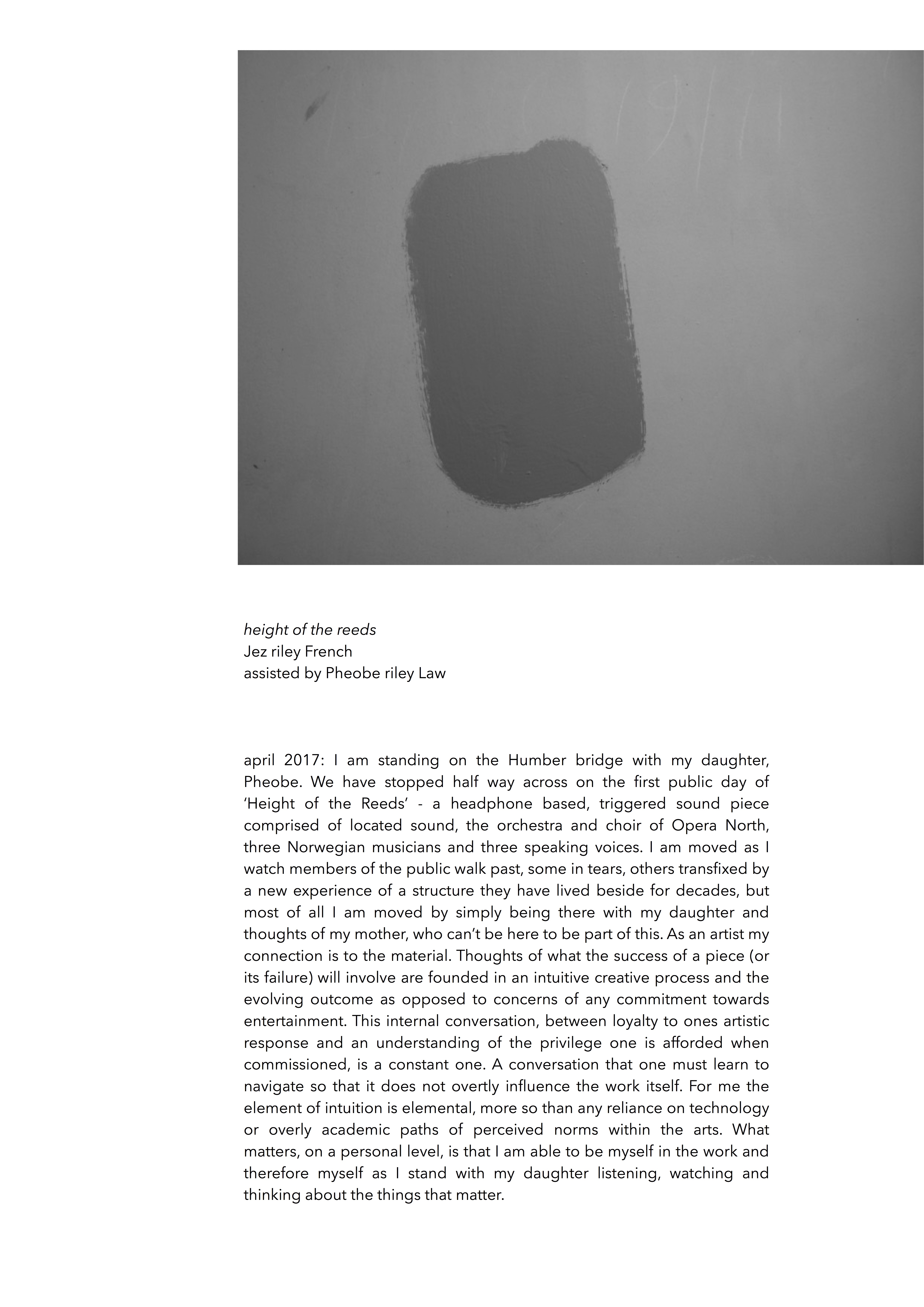 JrF: as the scores (scores for listening) are indeterminate it is, in essence, a collaboration between the scores themselves, my involvement and each person who experiences them. In that sense i’m not sure it is my role to recognise my intention in anyone else’s thoughts about them, if you see what I mean. I would perhaps though only say that I am of the firm belief that one elemental aspect of located sound (non-studio created or ordered sound) is that it cannot ever be recreated in a studio, not in any sense at all. That is one reason why it is endlessly fascinating – it is radically different every second & never fully repeats – some elements might but the combinations continue in constant flux.