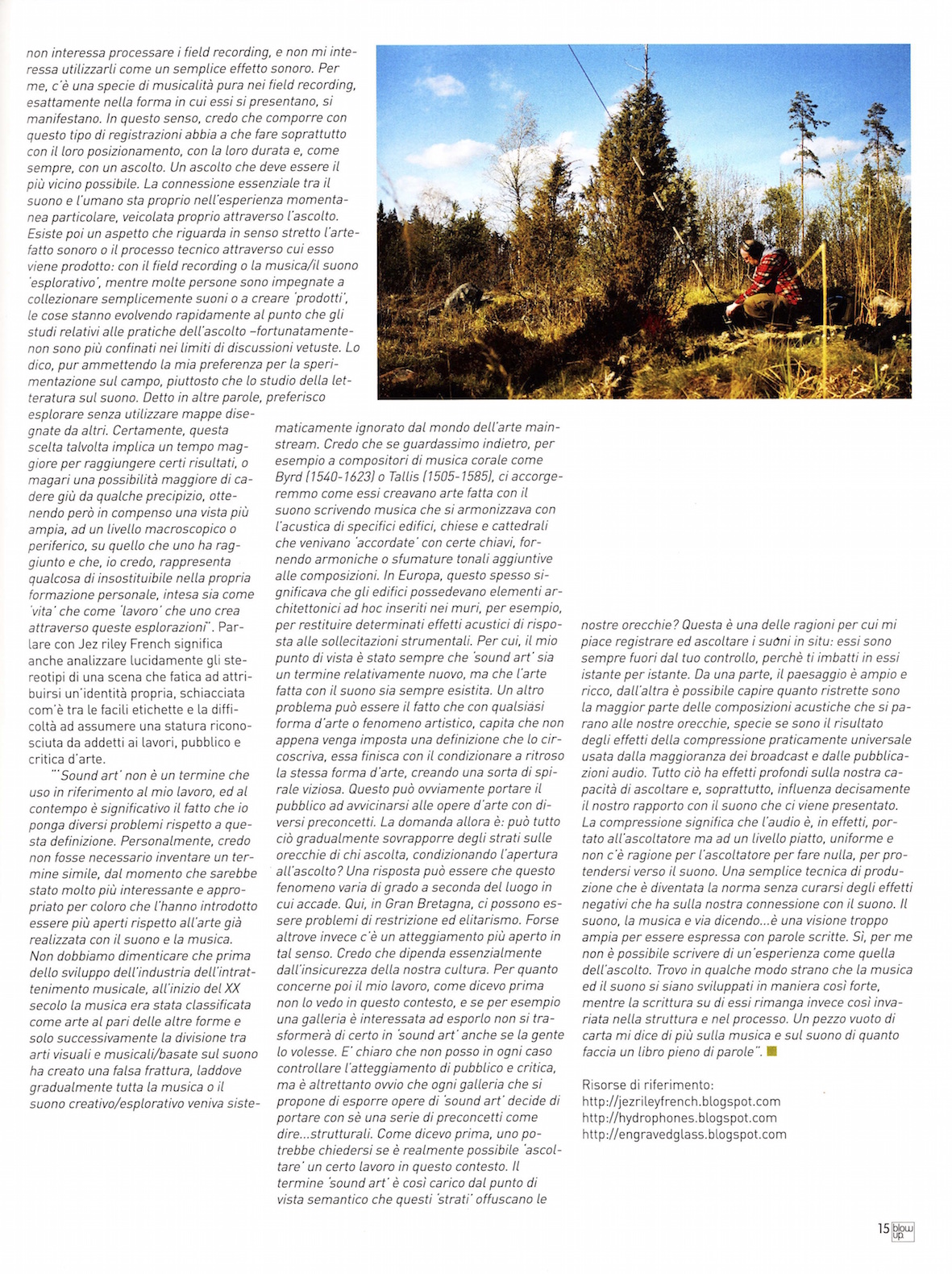 JrF: I’m on the side that rejects the definitions we have placed on ‘nature’, in so much as I believe we are simply another species & so I don’t separate an environment such as a forest to that of an urban location. Every place is different of course, at every time it is experienced, but I don’t have a border between ‘nature’ and ‘human’. In that sense all of my work is about ‘nature’, even when dealing with inanimate objects. I’m not a ‘sound collector’ so I tend not to have a motivation, aside from in documentary elements of projects perhaps, to plan what I might record. I listen to what is there, if i’m able (practically or in terms of how connected I feel to the process at the time) & that is what guides me.